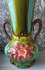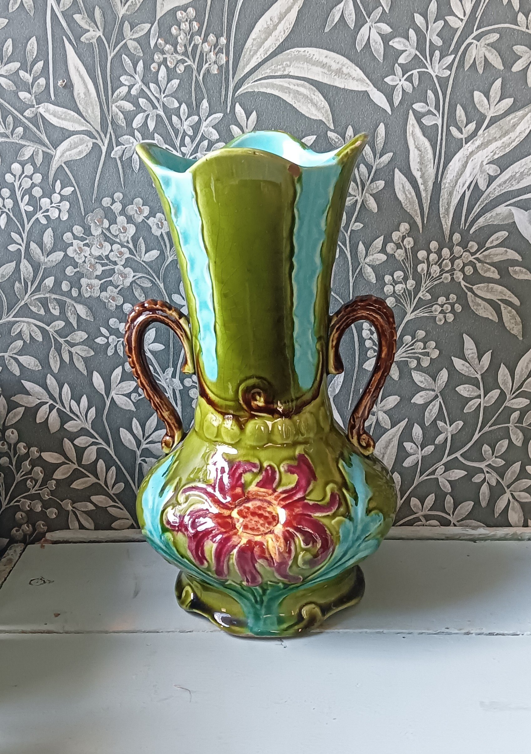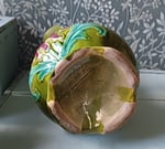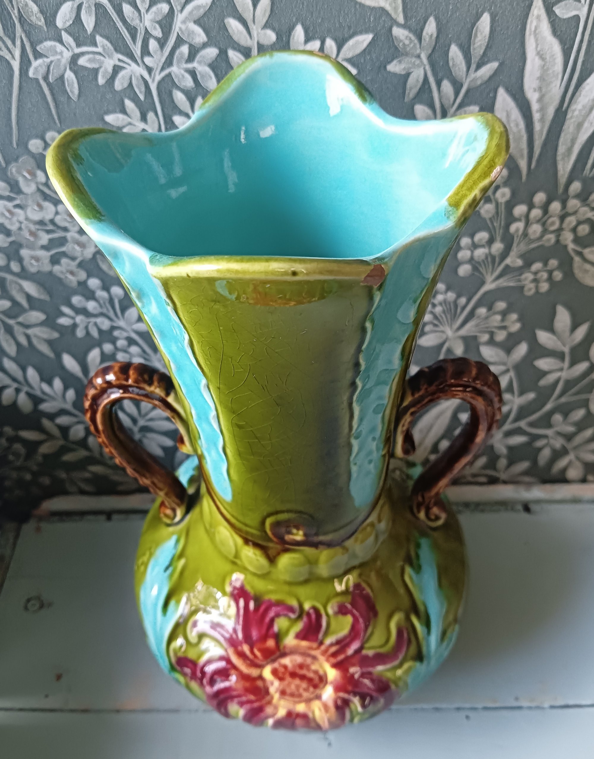 Charmant vase en barbotine aux couleurs éclatantes : vert profond, turquoise et touches de rouge et jaune pour le décor floral en relief. Belle brillance et travail de relief typique de cette céramique décorative.