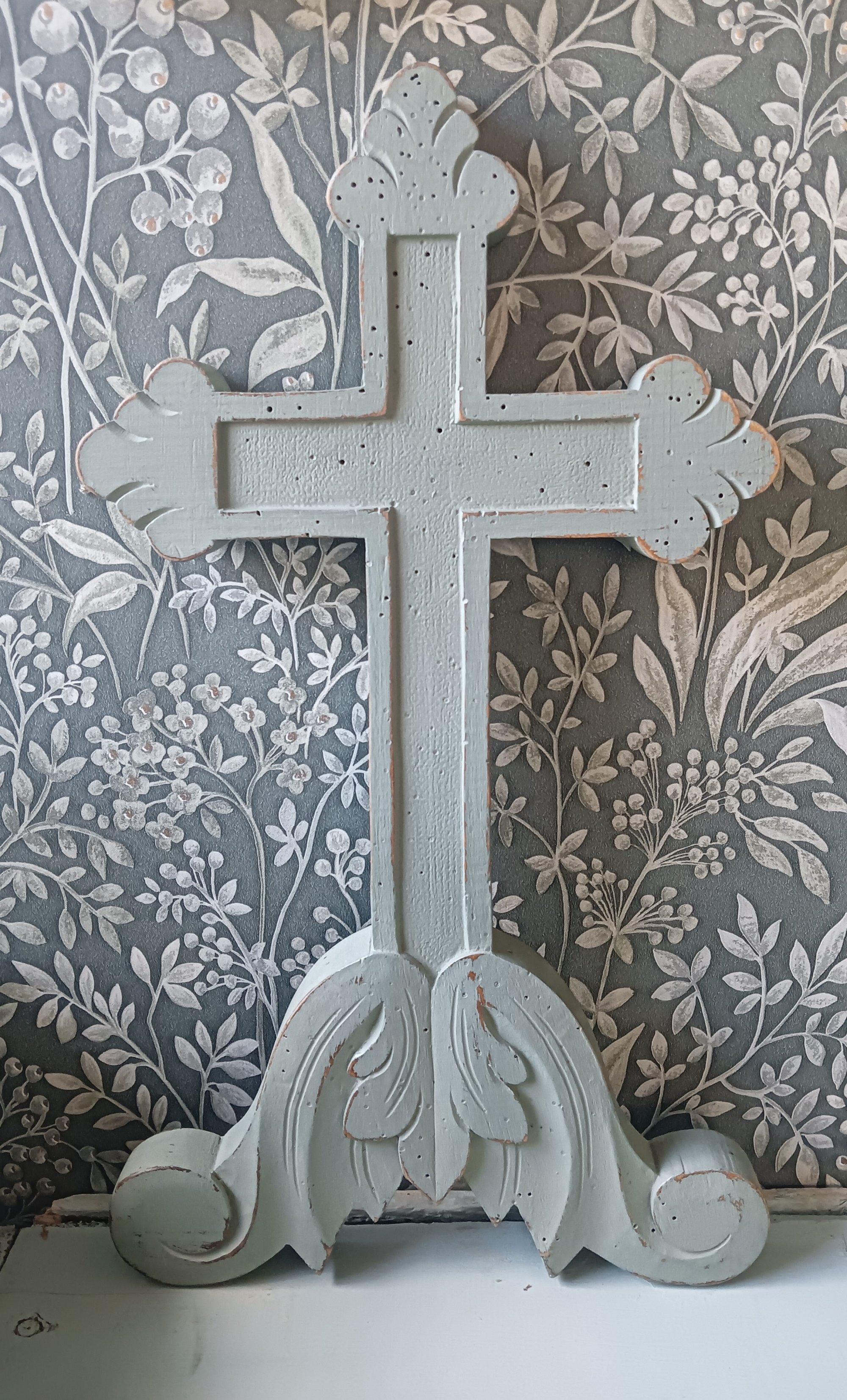 Charmante croix ancienne en bois, patinée dans une belle teinte gris vert au style campagne chic. Elle se pose facilement sur un meuble ou une étagère pour apporter une touche d’authenticité et de douceur à votre décoration intérieure.