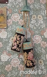 Cette lampe baladeuse artisanale est habillée d’un abat-jour cylindrique réalisé à partir d’un tissu ancien aux motifs floraux délicats, se détachant sur un fond sombre, rehaussé de touches de vert d’eau et de roses poudrés.