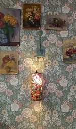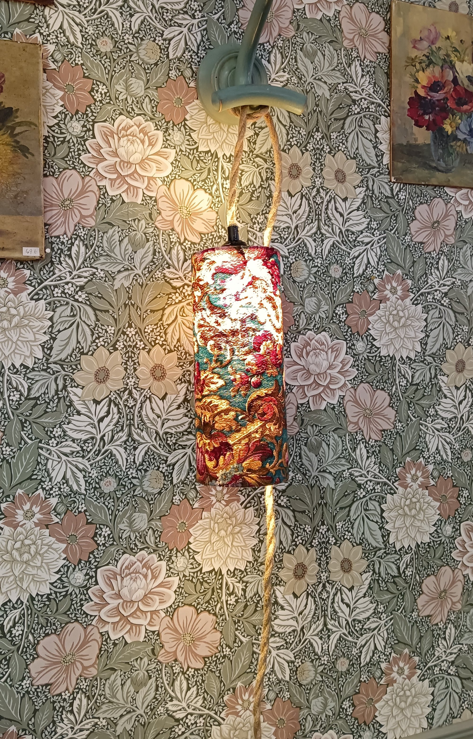 Cette lampe baladeuse artisanale est habillée d’un abat-jour cylindrique réalisé dans un tissu ancien richement ornementé, aux motifs floraux et arabesques inspirés des tapisseries d’autrefois.
