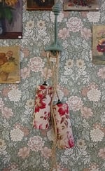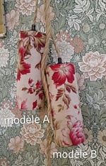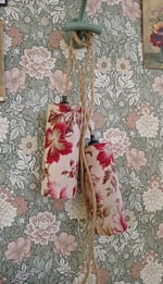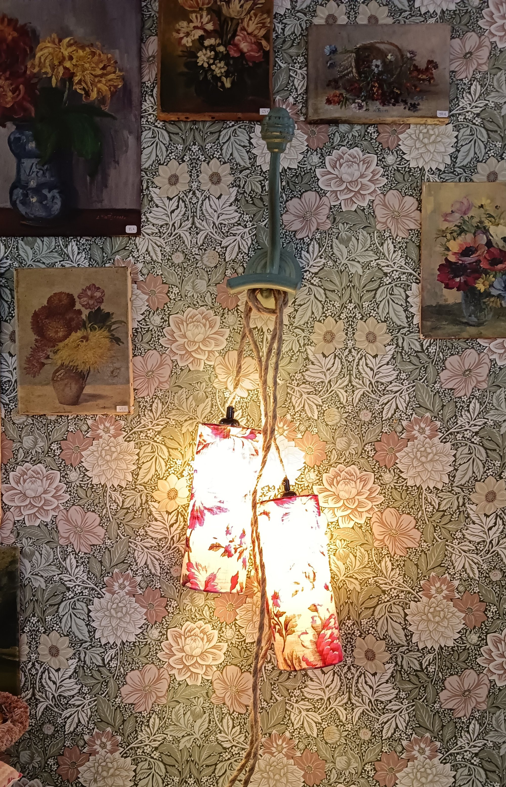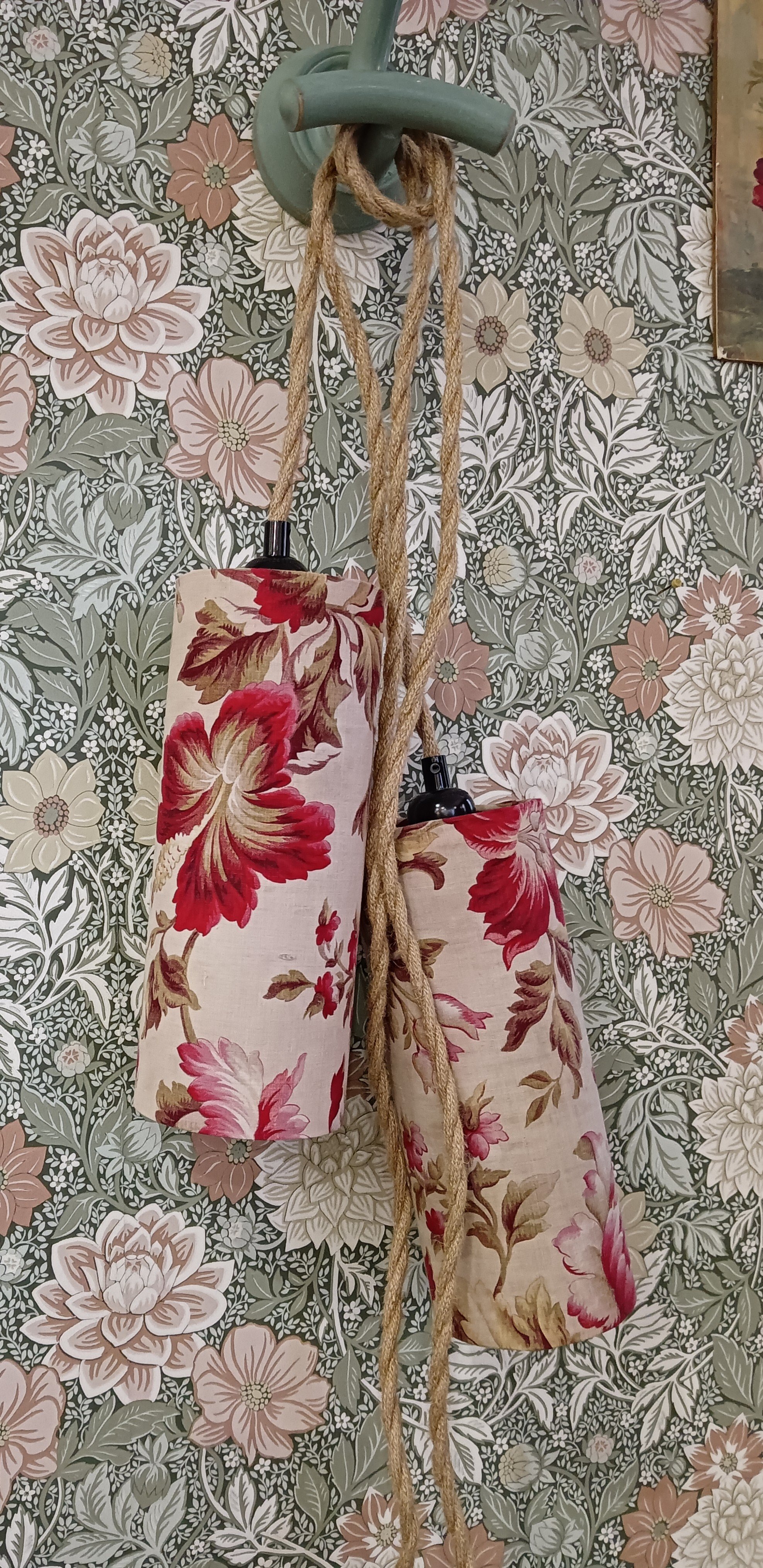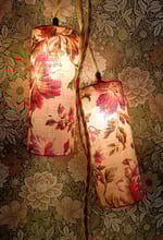 Cette lampe baladeuse artisanale est habillée d’un abat-jour cylindrique confectionné à partir d’un tissu ancien à motifs floraux, aux nuances délicates de roses et de rouges patinés par le temps.