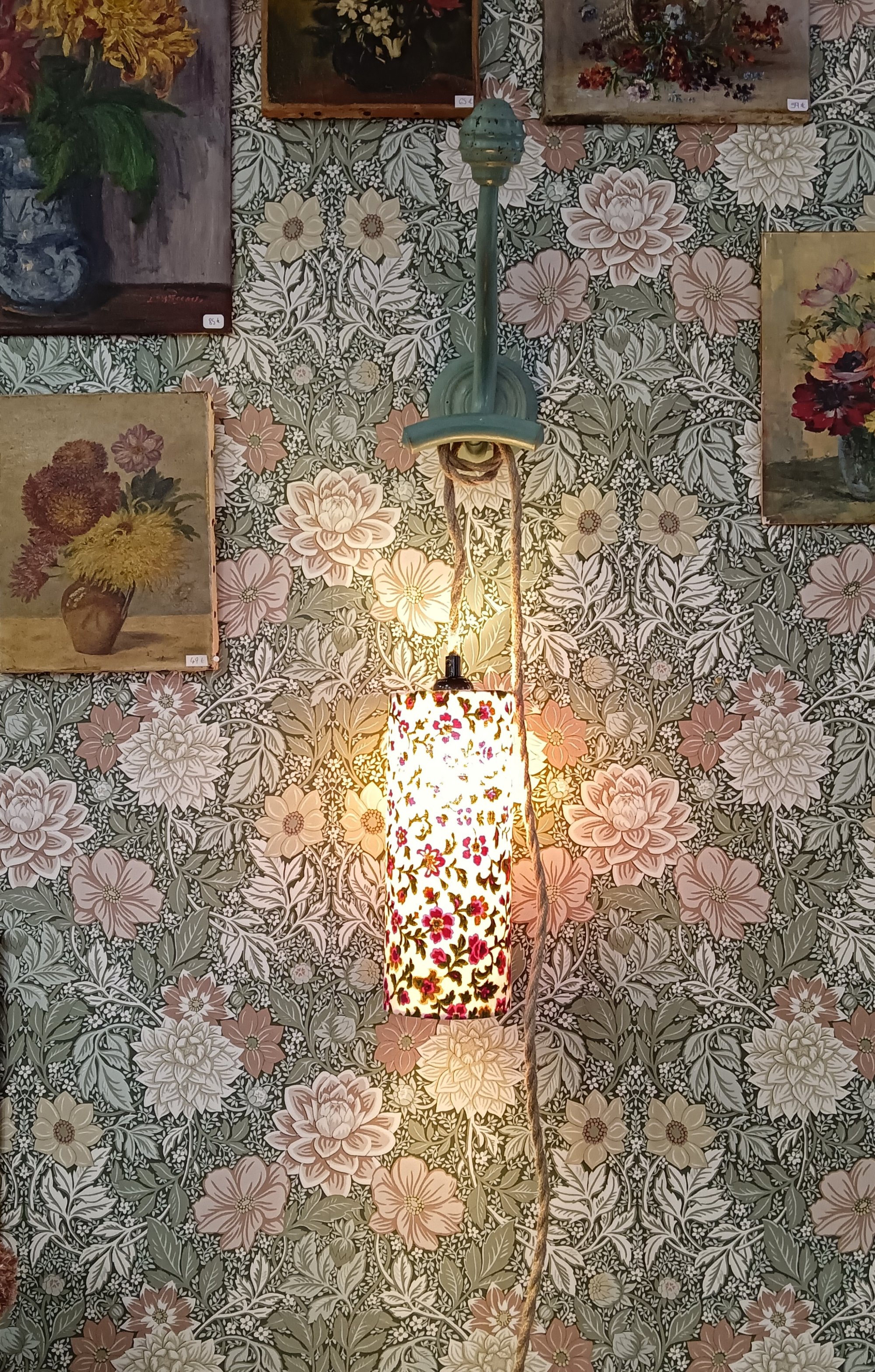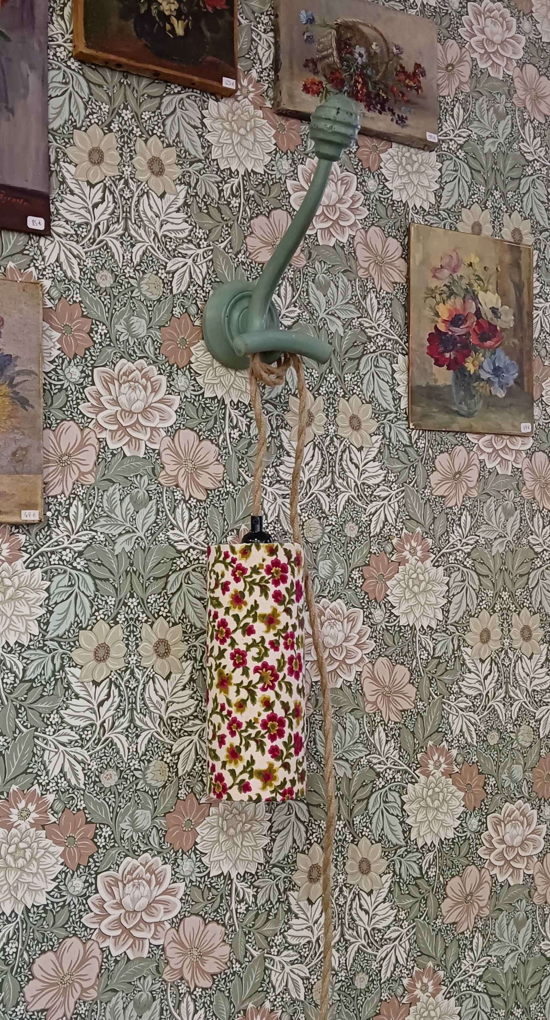 Cette lampe baladeuse artisanale est habillée d’un abat-jour cylindrique réalisé dans un tissu ancien à motifs de petites fleurs, délicatement colorées dans des tons roses et verts.