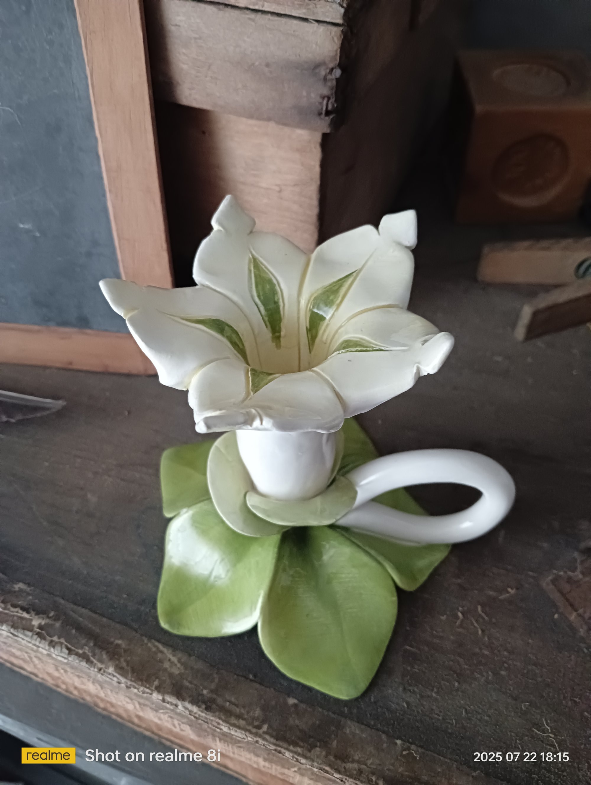 Un délicat bougeoir ancien en barbotine, en forme de fleur blanche épanouie reposant sur un socle de feuilles vert tendre. Avec sa poignée élégante et ses détails finement modelés, il apporte une touche de poésie et de nature à votre décoration. Une pièce pleine de charme, idéale sur une table, une console ou dans une vitrine.