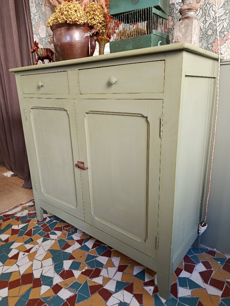 Ce buffet parisien au charme authentique a été délicatement patiné dans un vert de gris doux et enveloppant, rappelant les teintes naturelles des jardins anciens.