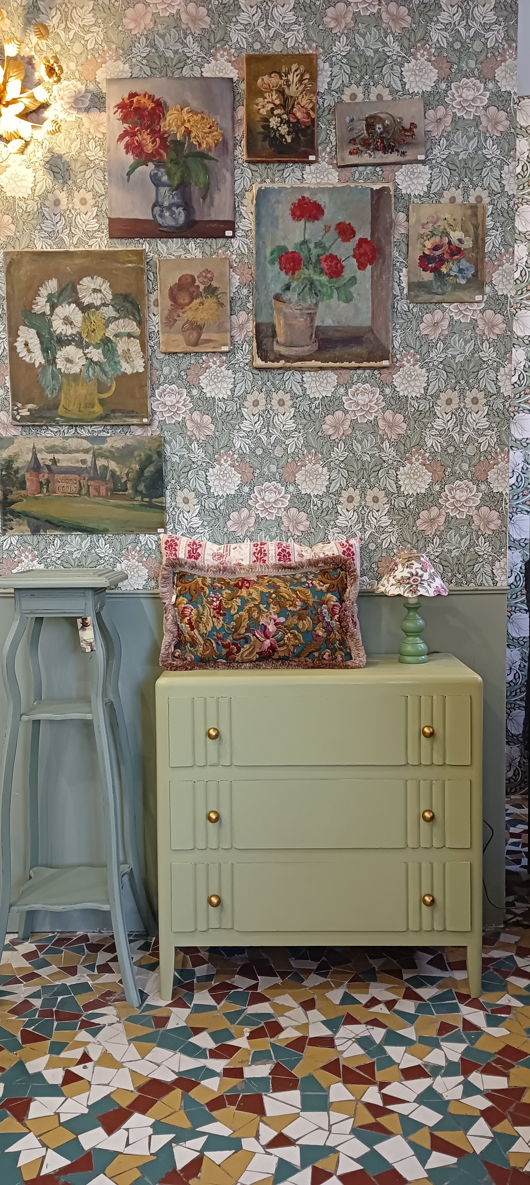 Cette commode ancienne a été entièrement revisitée avec soin, dans un vert doux et lumineux, parfaitement en accord avec les intérieurs de charme et les ambiances campagne chic.