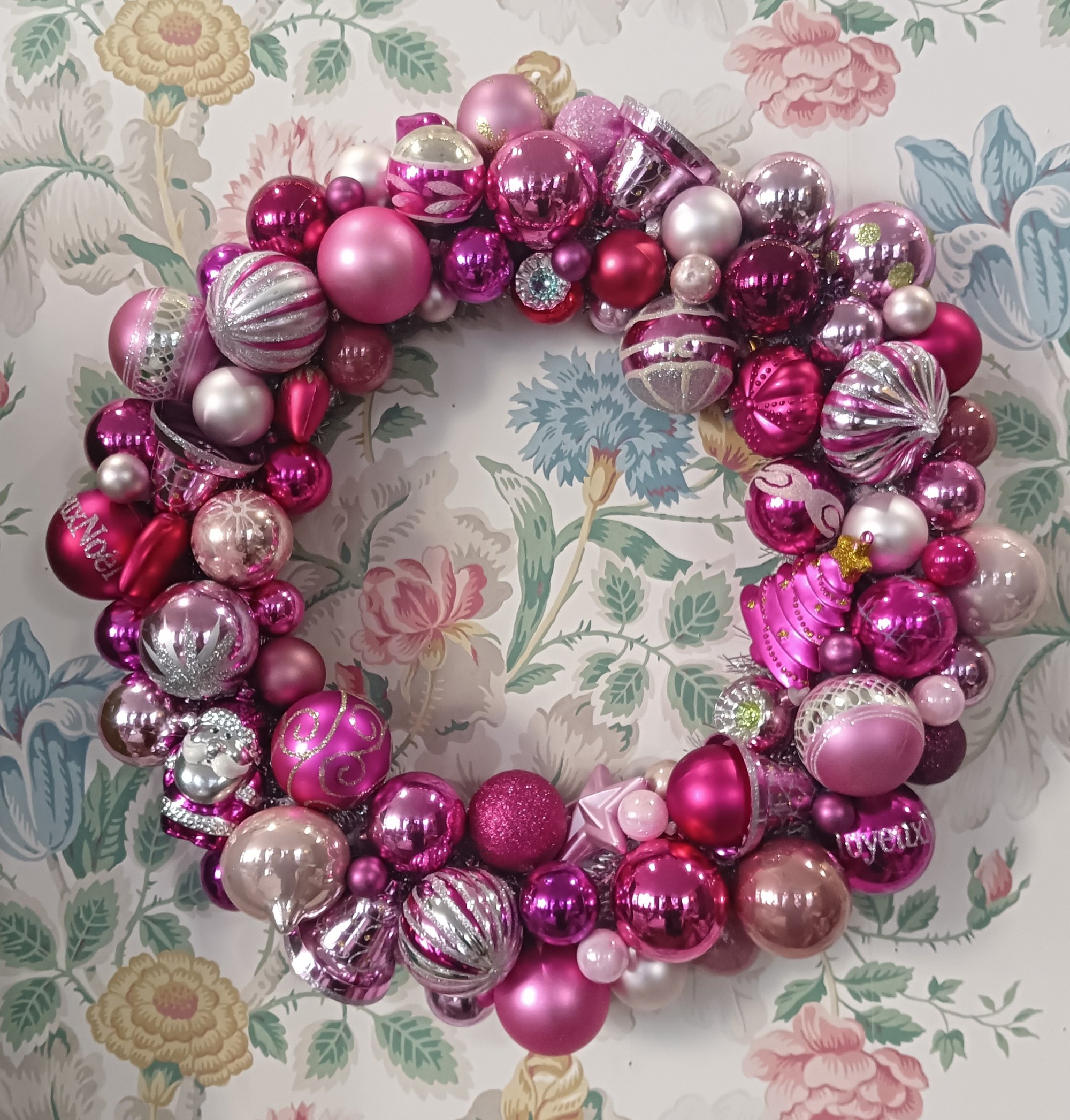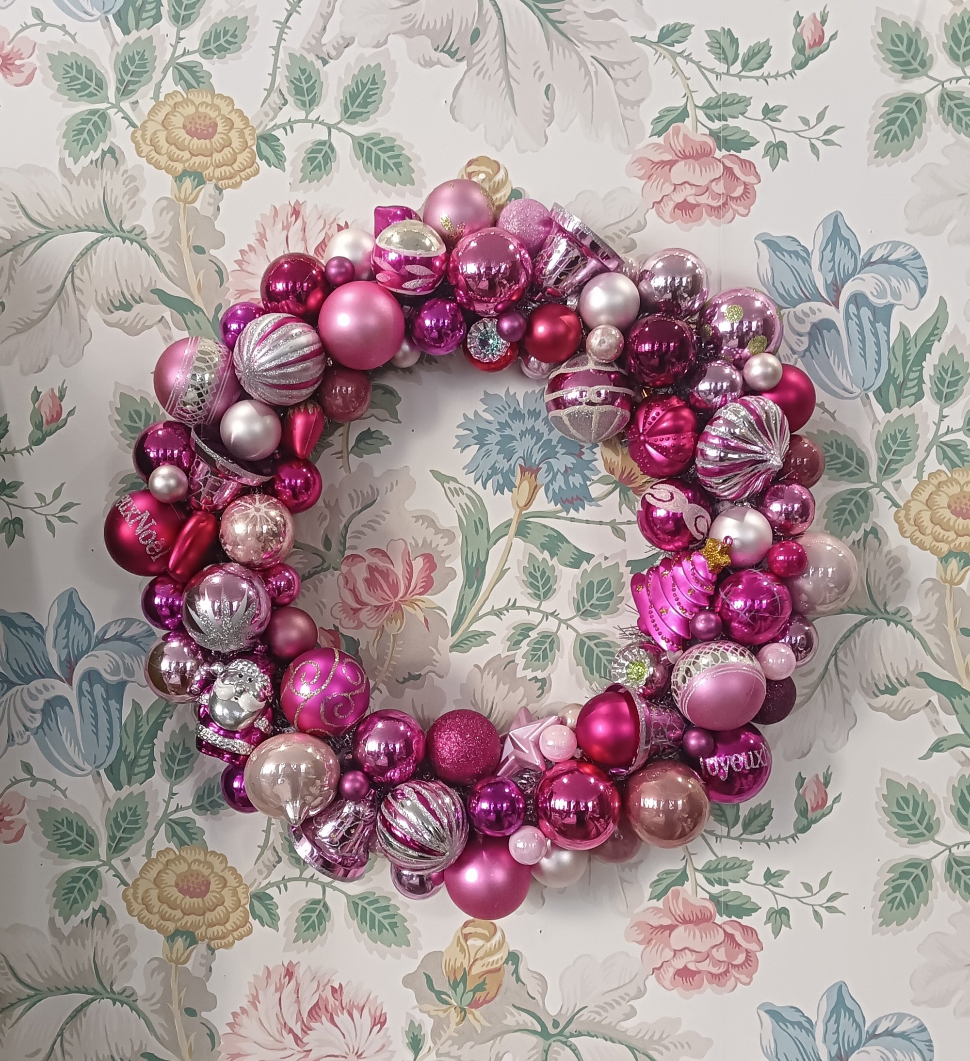 Couronne de Noël réalisée à la main, composée d’un assemblage raffiné de boules aux tons rose, fuchsia, vieux rose et nacré. Jeux de brillances et de textures pour un rendu élégant, lumineux et résolument festif.