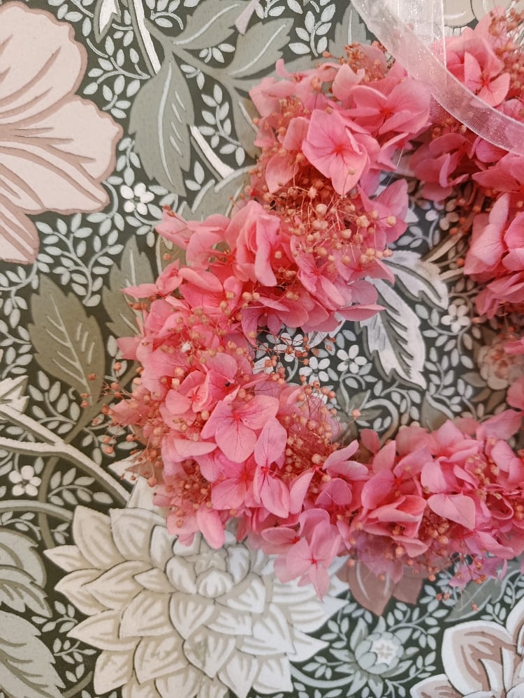 Couronne cœur en fleurs stabilisées – Hortensia rose & gypsophile rose.