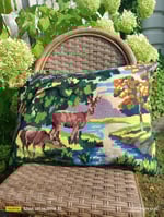 Une scène bucolique s’invite dans votre intérieur : deux daims paisibles au bord d’un ruisseau, sous les arbres colorés d’un paysage ancien.