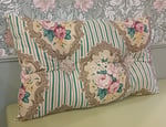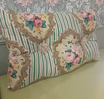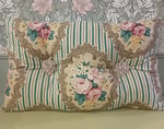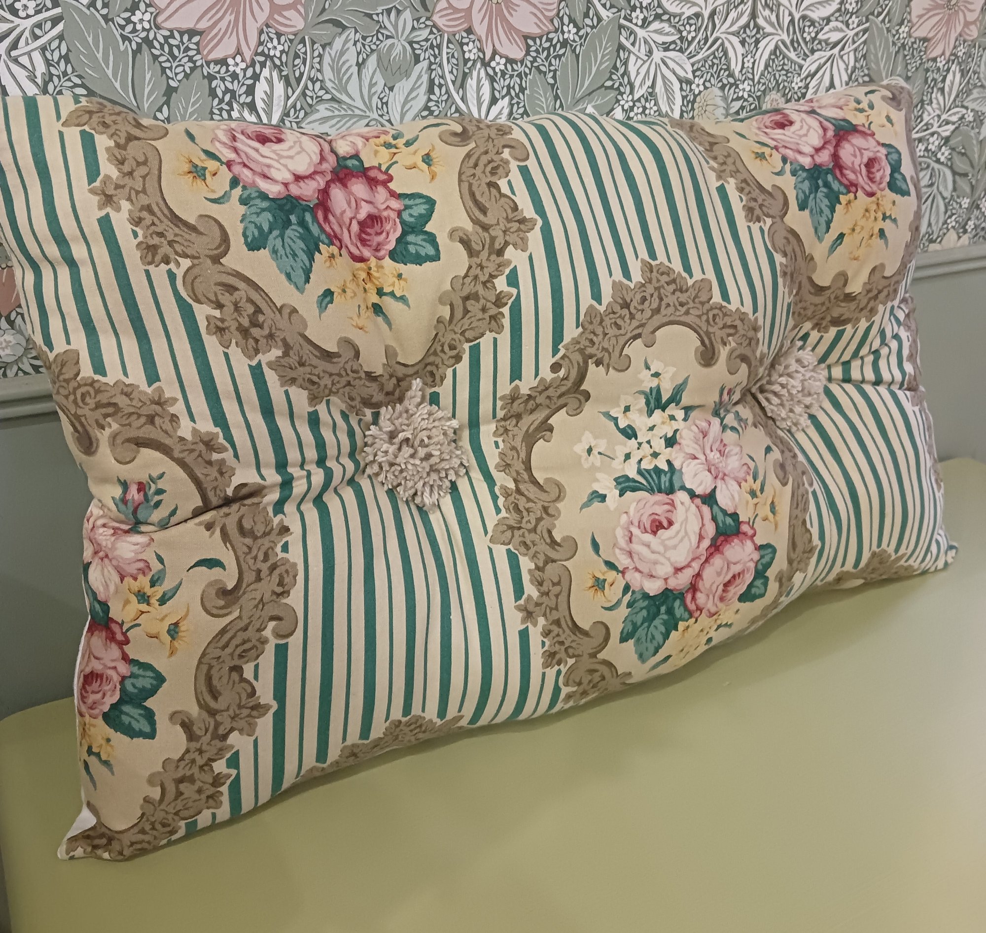 Son tissu à rayures vert tendre est orné de médaillons floraux aux roses anciennes, encadrés de motifs esprit baroque, pour une ambiance maison de campagne chic et poétique.