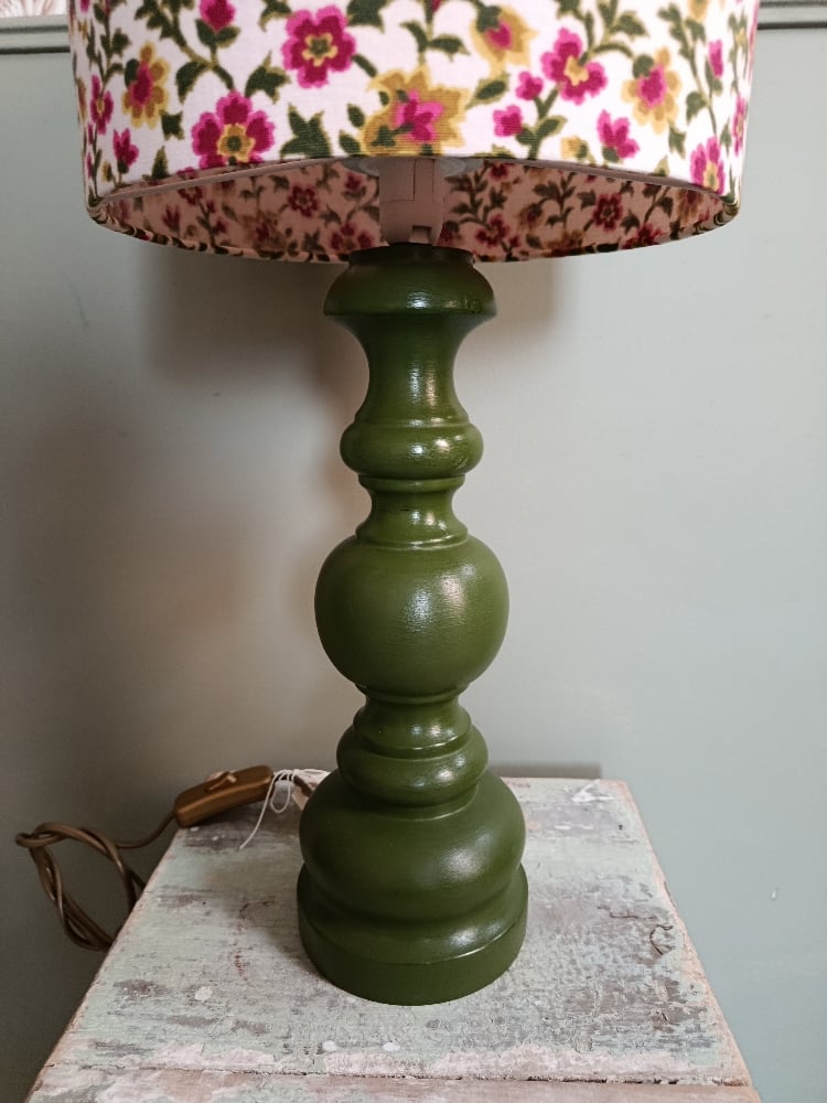 Élégante lampe de table au pied tourné en bois, peint dans un vert profond et chaleureux. Son abat-jour aux motifs floraux éclatants mêle rose, framboise et feuillage, apportant une touche romantique et pleine de caractère.
