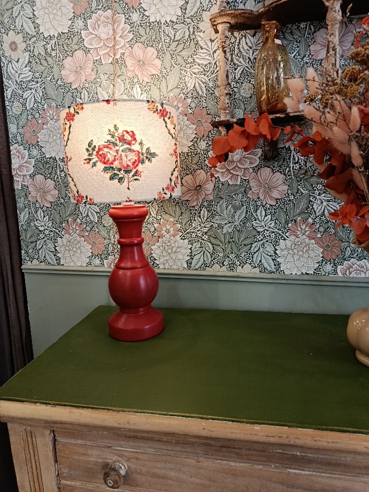 Le contraste entre le rouge profond du pied et la douceur du motif floral apporte caractère et poésie à l’ensemble. Une pièce chaleureuse, idéale pour créer une ambiance douce et feutrée dans un intérieur.