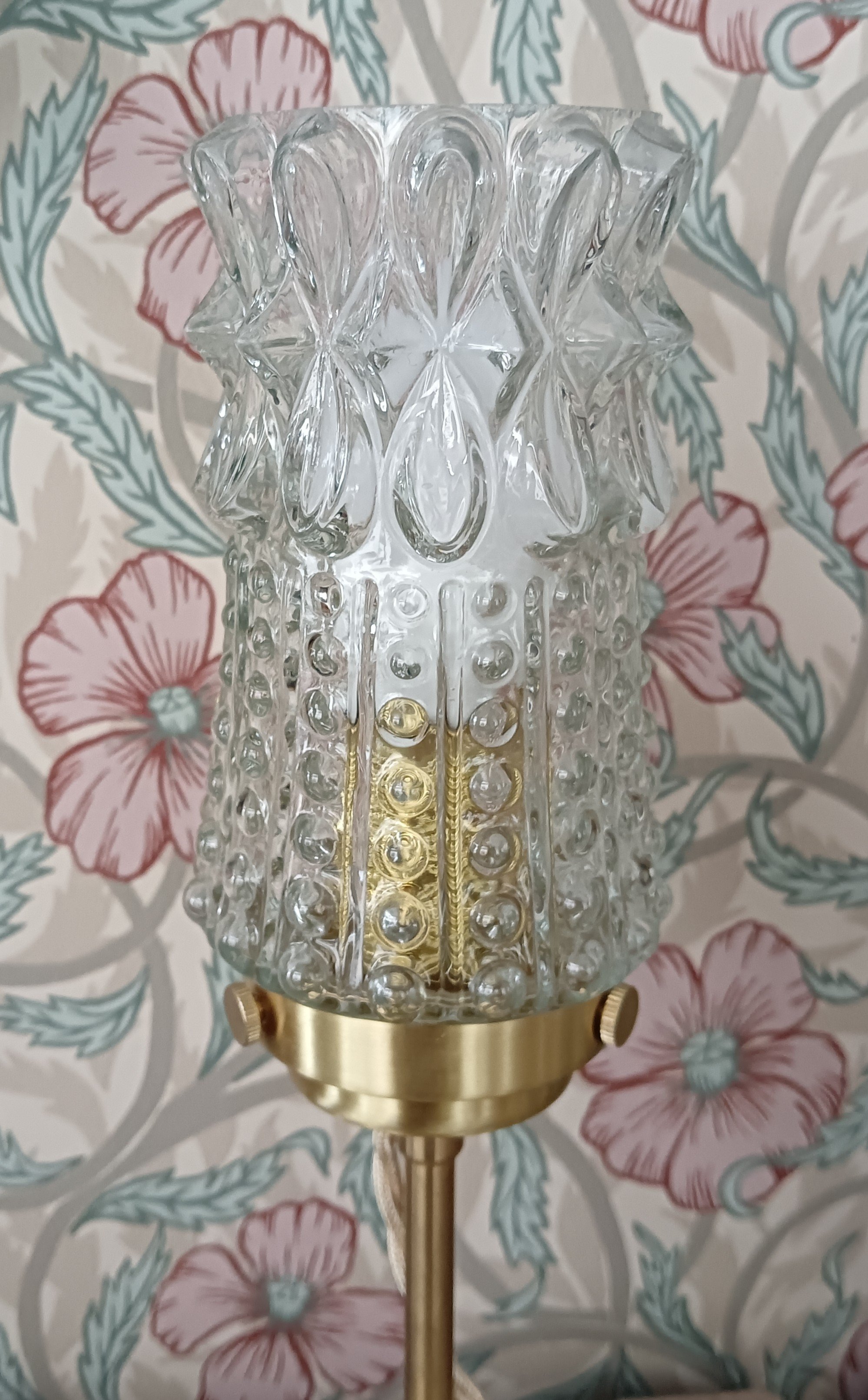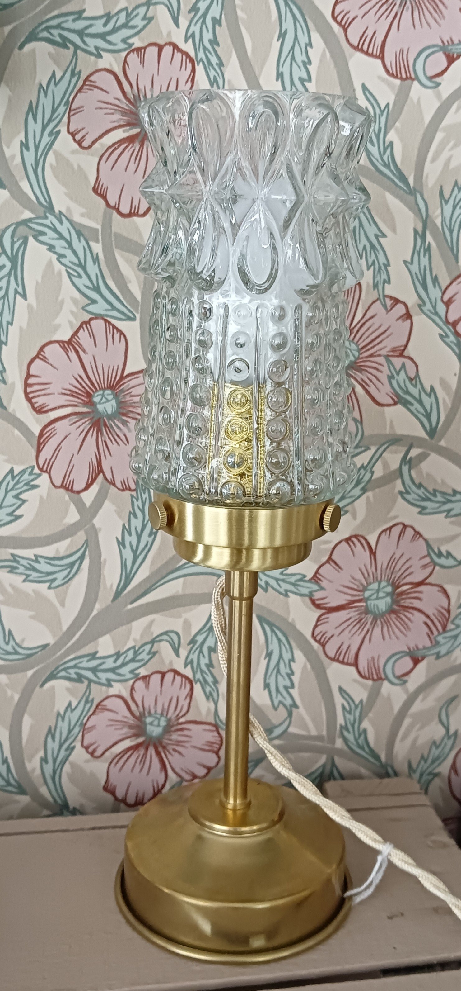 Charmante lampe de table composée d’un élégant globe en verre vintage finement travaillé, monté sur un pied en laiton. Son cordon électrique torsadé doré avec fiche et interrupteur apporte une touche rétro chic et raffinée.