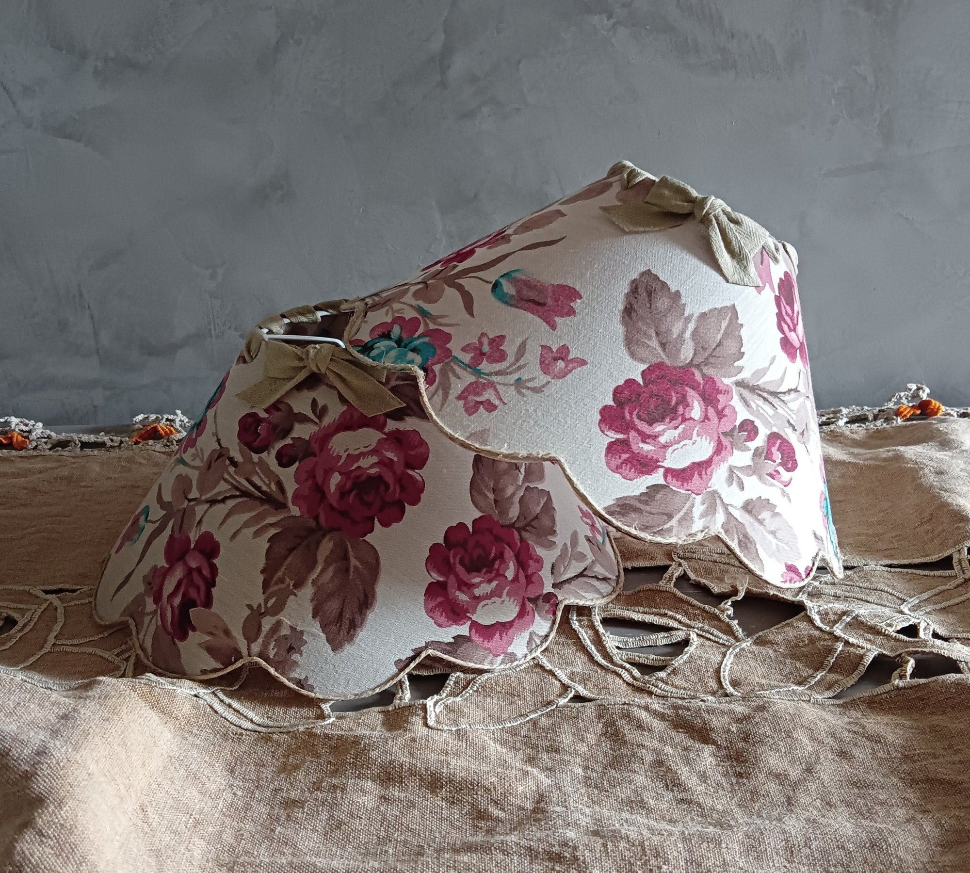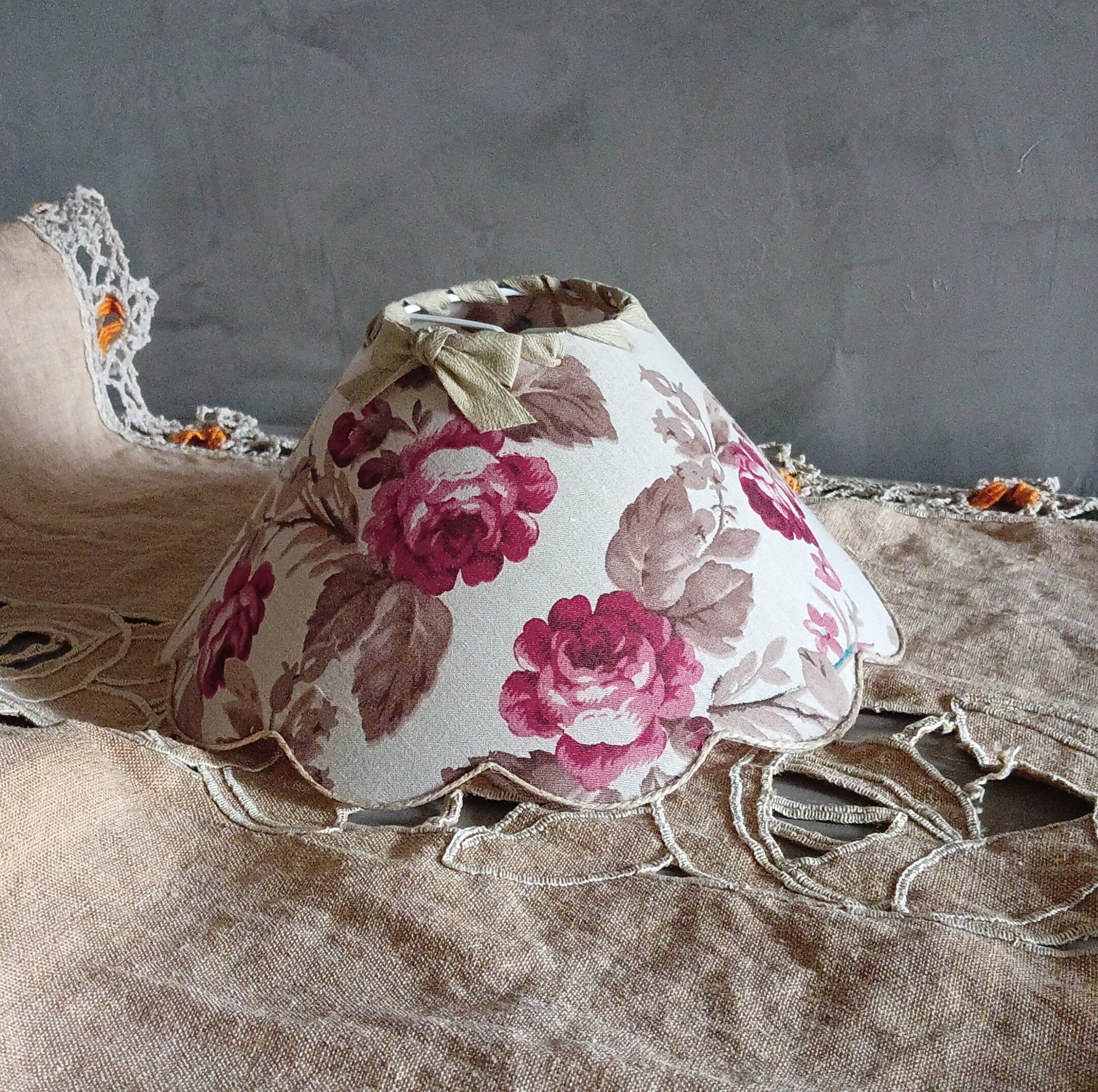Abat-jour fait main en tissu fleuri rose framboise et lin, finition élégante et charme rétro