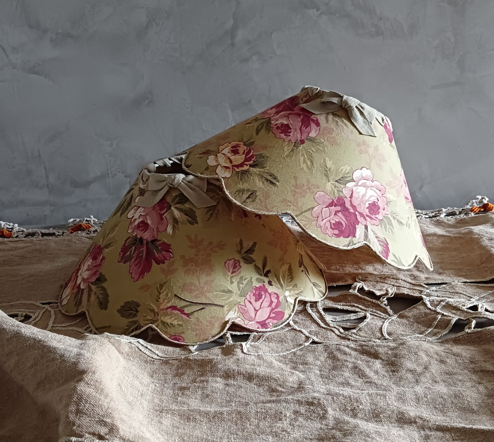 Abat-jour fait main en tissu fleuri rose sur fond vert, finition élégante et charme rétro