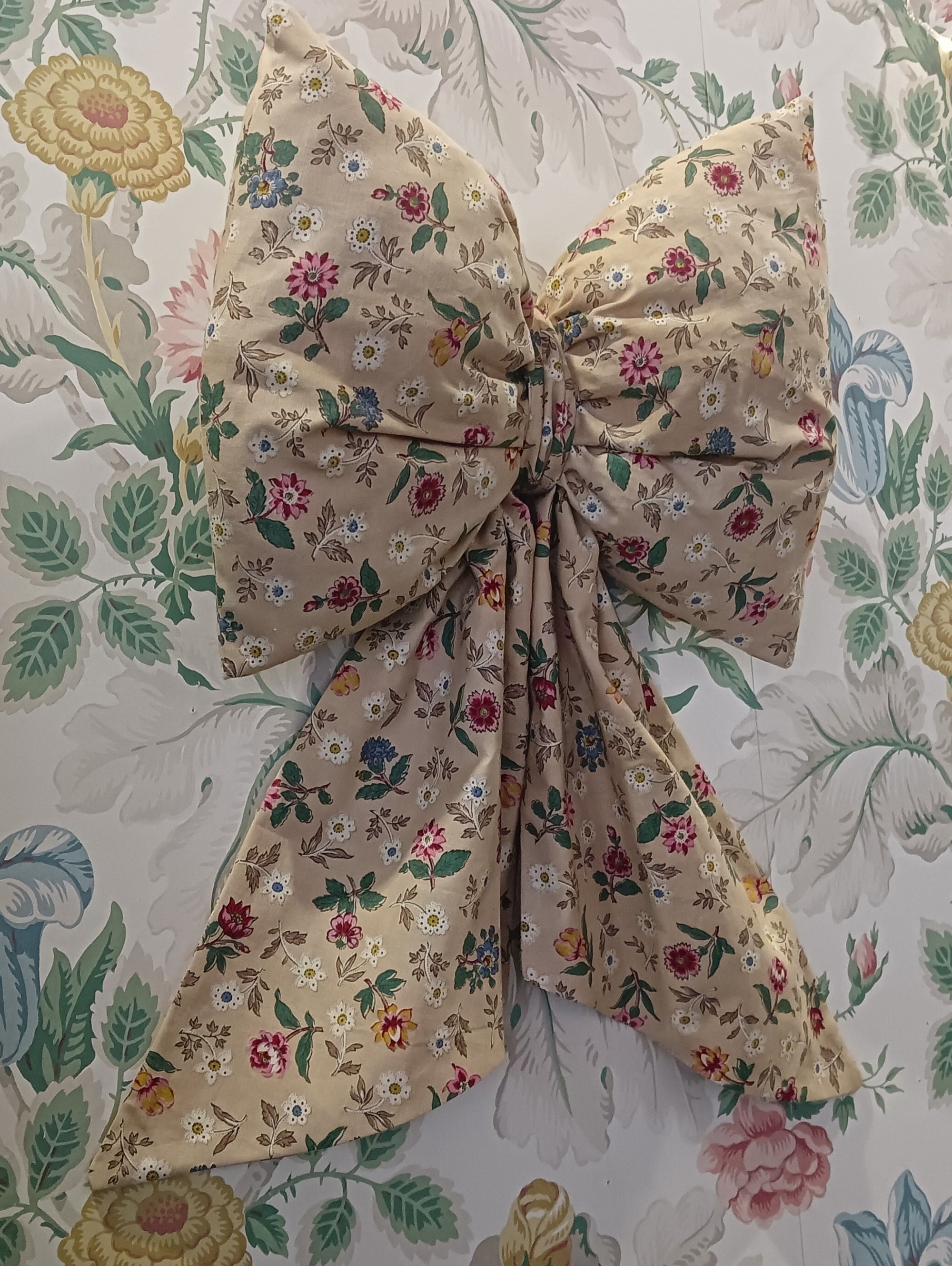 Ce joli nœud confectionné dans un tissu vintage au délicat motif fleuri apporte une touche romantique et poétique à votre décoration. Ses couleurs douces et son esprit ancien en font un élément de charme parfait pour habiller un mur, une porte, une couronne ou une mise en scène de vitrine.