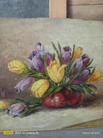 Délicate nature morte représentant un bouquet de tulipes jaunes et violets dans un petit vase rustique, cette peinture à l’huile sur carton séduit par ses couleurs douces et sa composition intemporelle. Signée "CR", elle évoque le charme discret de la peinture de fleurs d’atelier, parfaite pour une décoration au style vintage ou romantique. À poser ou à encadrer selon vos envies.