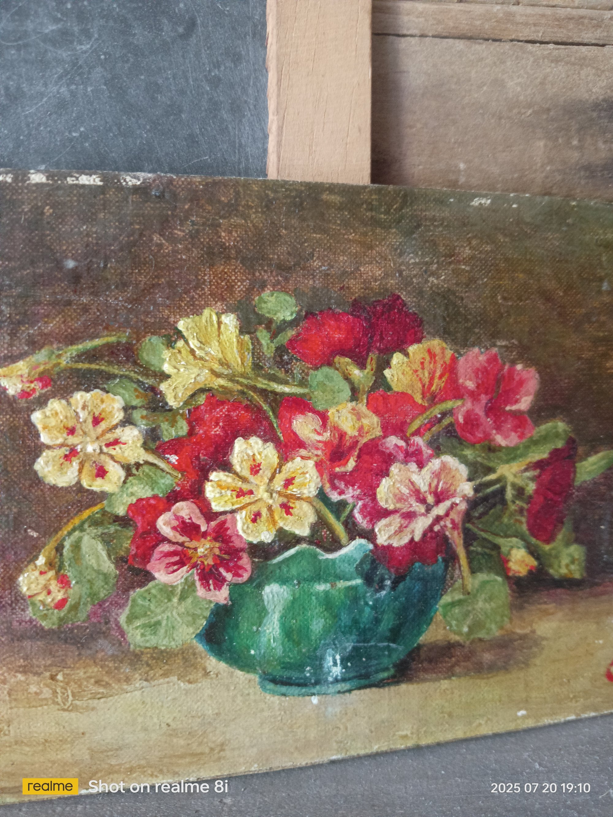 Charmante peinture à l’huile sur carton représentant un bouquet de capucines aux tons oranges et jaunes , délicatement disposé dans un vase vert émaillé. L’arrière-plan sombre fait joliment ressortir les couleurs vibrantes des fleurs.