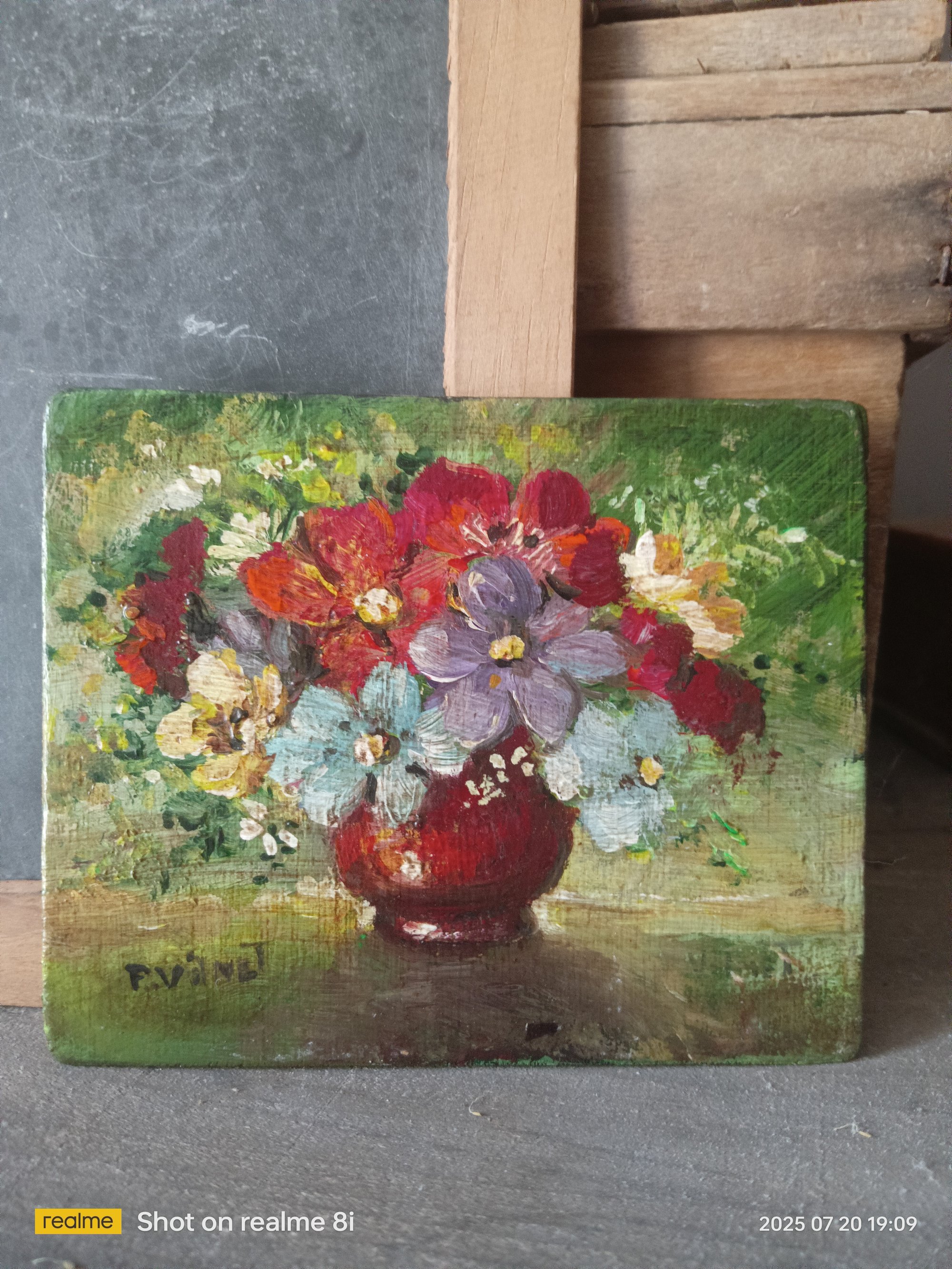 Charmante peinture à l’huile sur bois représentant un bouquet de fleurs aux tons doux et lumineux. Des fleurs aux nuances de bordeaux, bleu ciel et jaune se détachent sur un fond verdoyant, évoquant un jardin en pleine floraison.