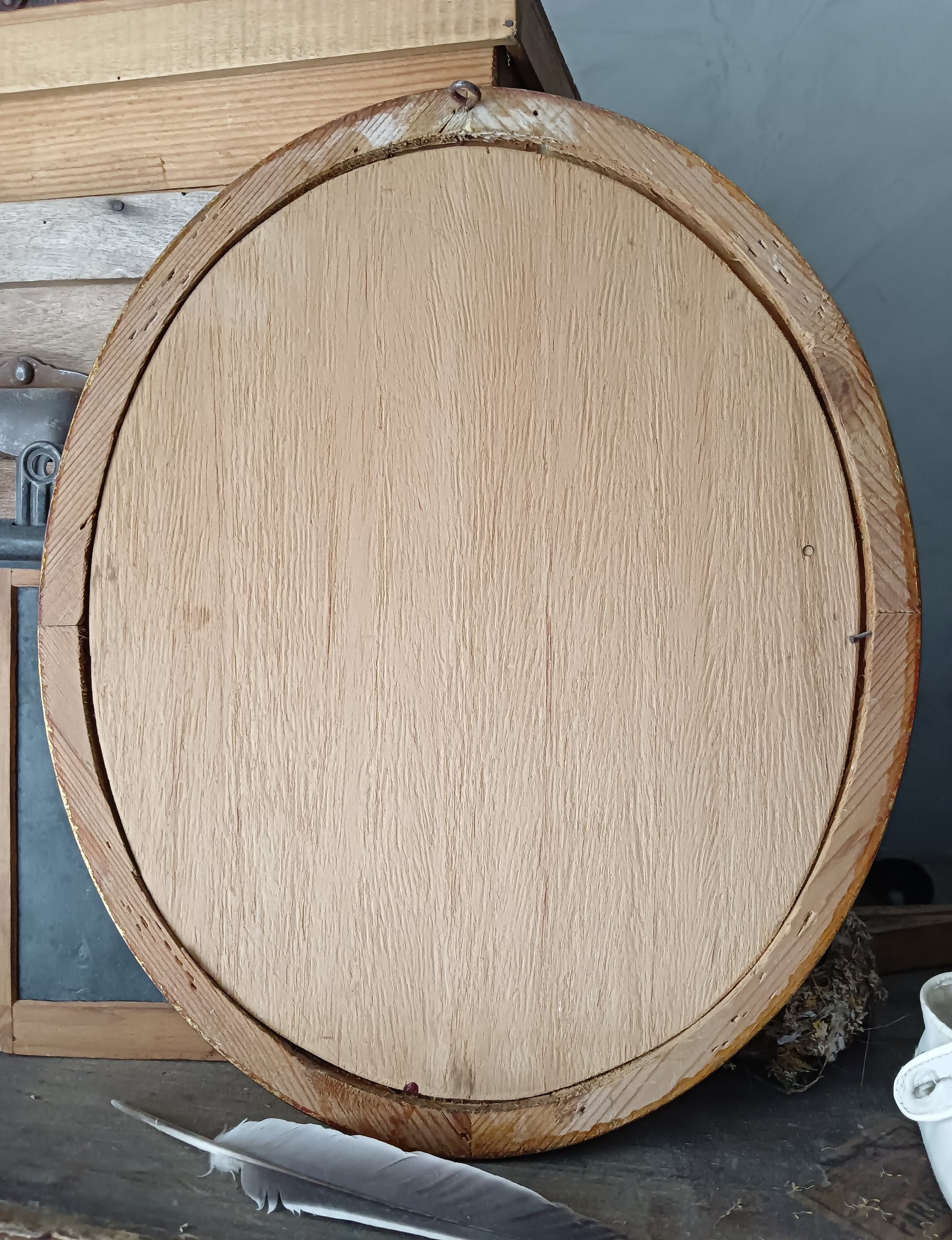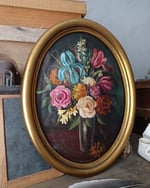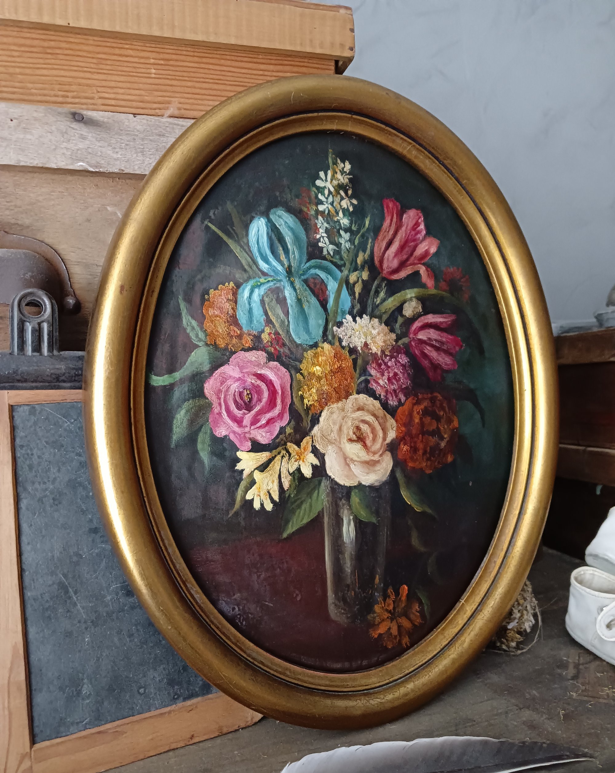 Charmante peinture ancienne réalisée à l’huile sur panneau de bois, représentant un bouquet foisonnant de fleurs aux couleurs vives : roses, iris et tulipes se mêlent avec élégance dans un vase sobre. Le cadre ovale en bois doré souligne le style classique et raffiné de cette composition.