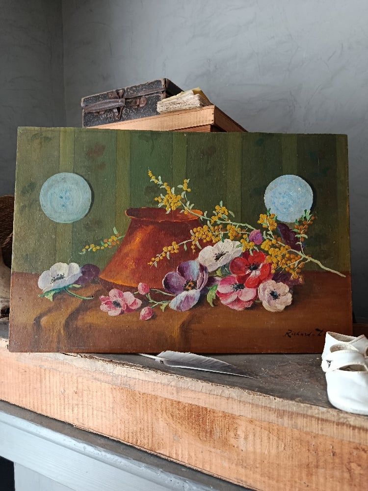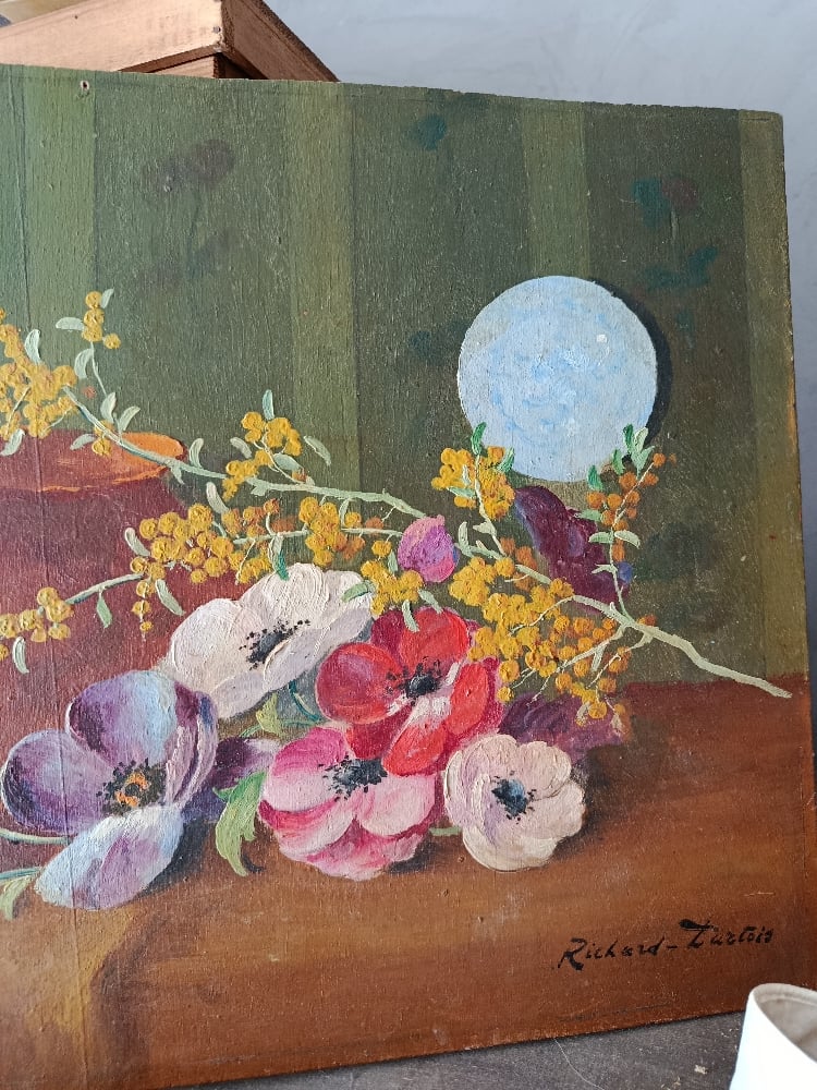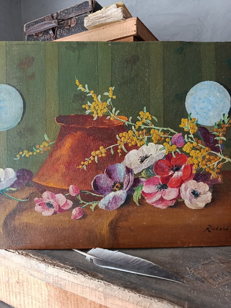 Élégante peinture à l’huile représentant une délicate composition florale d’anémones et de mimosa. Les anémones aux teintes rouges, rosées et violacées contrastent harmonieusement avec la légèreté lumineuse des petites fleurs dorées de mimosa.