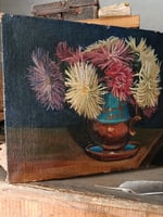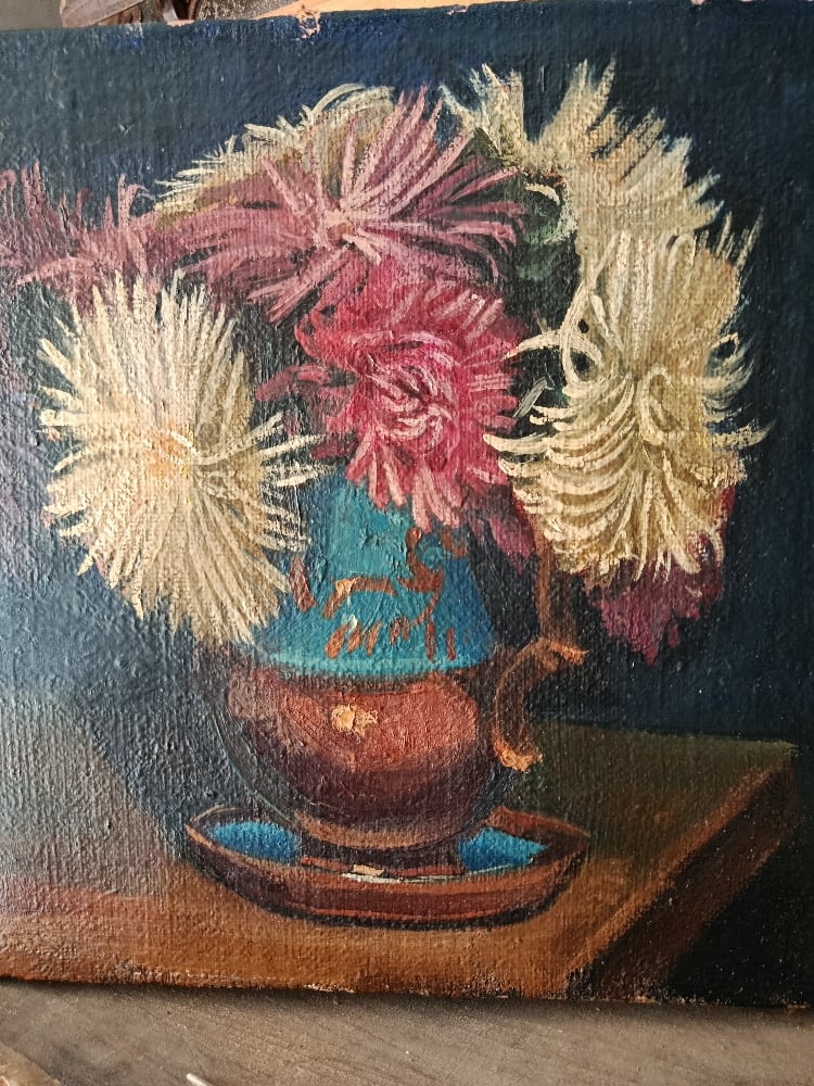 Charmante peinture à l’huile représentant un bouquet généreux de fleurs aux pétales délicatement effilés, disposé dans un petit vase posé sur une table. Les tonalités poudrées de crème, rose et framboise se détachent avec élégance sur un fond profond presque nocturne, donnant à l’ensemble une atmosphère douce et intemporelle.
