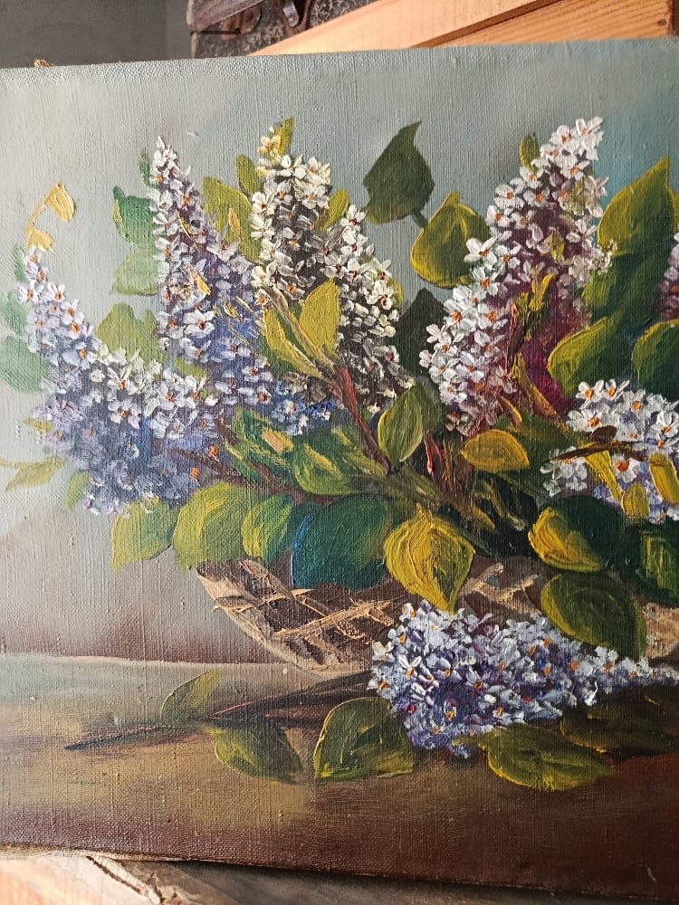 Charmante nature morte représentant un bouquet généreux de lilas fraîchement cueillis, délicatement disposés dans une corbeille posée sur une table. Les grappes de fleurs aux nuances de blanc, mauve et violet se mêlent à un feuillage dense et lumineux, créant une composition pleine de douceur et de fraîcheur printanière.
