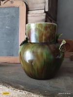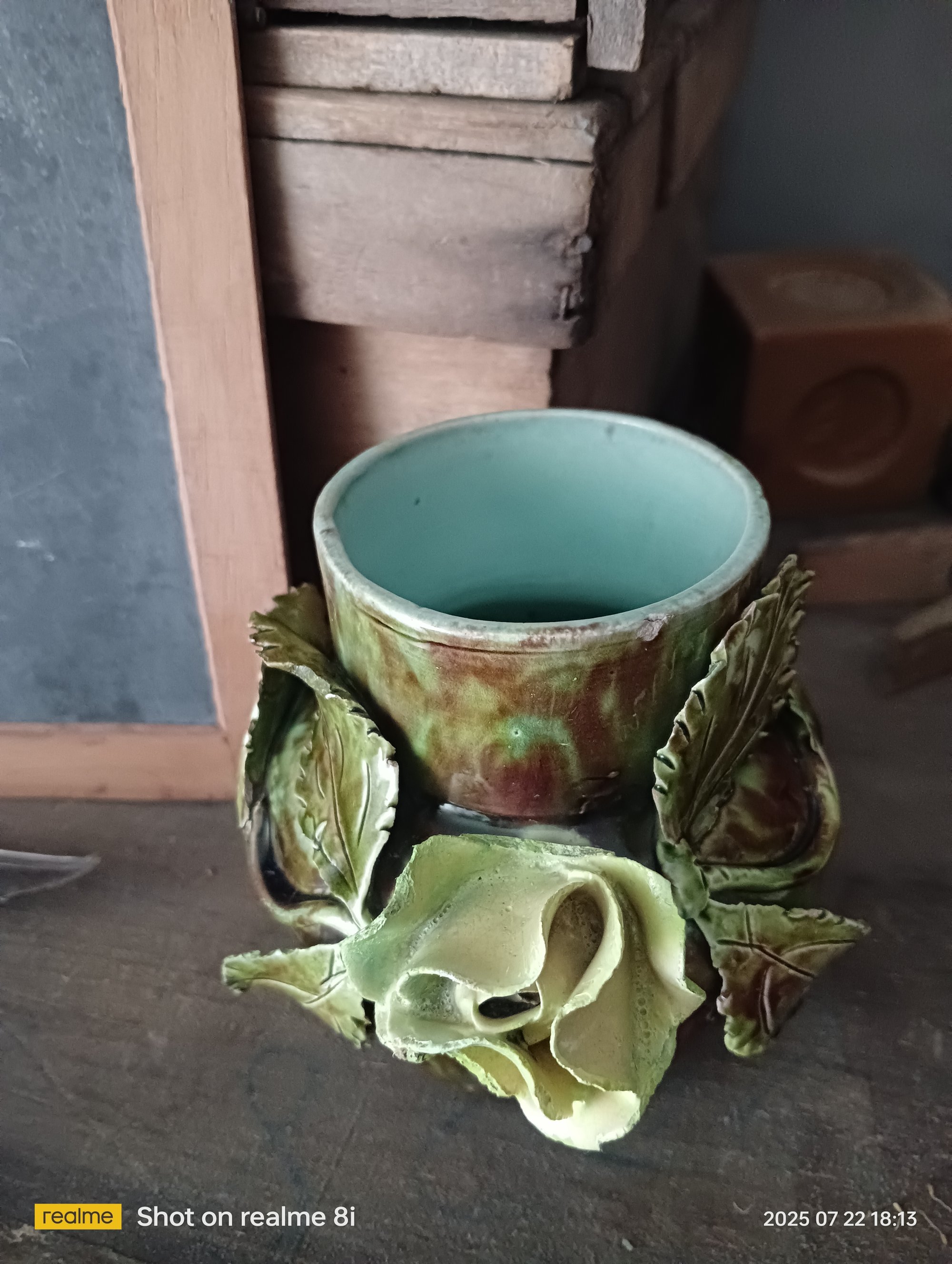 Charmant petit vase en barbotine aux nuances de vert profond et de brun, sublimé par un décor en relief de feuilles et de fleurs stylisées. L'intérieur émaillé bleu turquoise contraste joliment avec l'extérieur aux teintes naturelles.