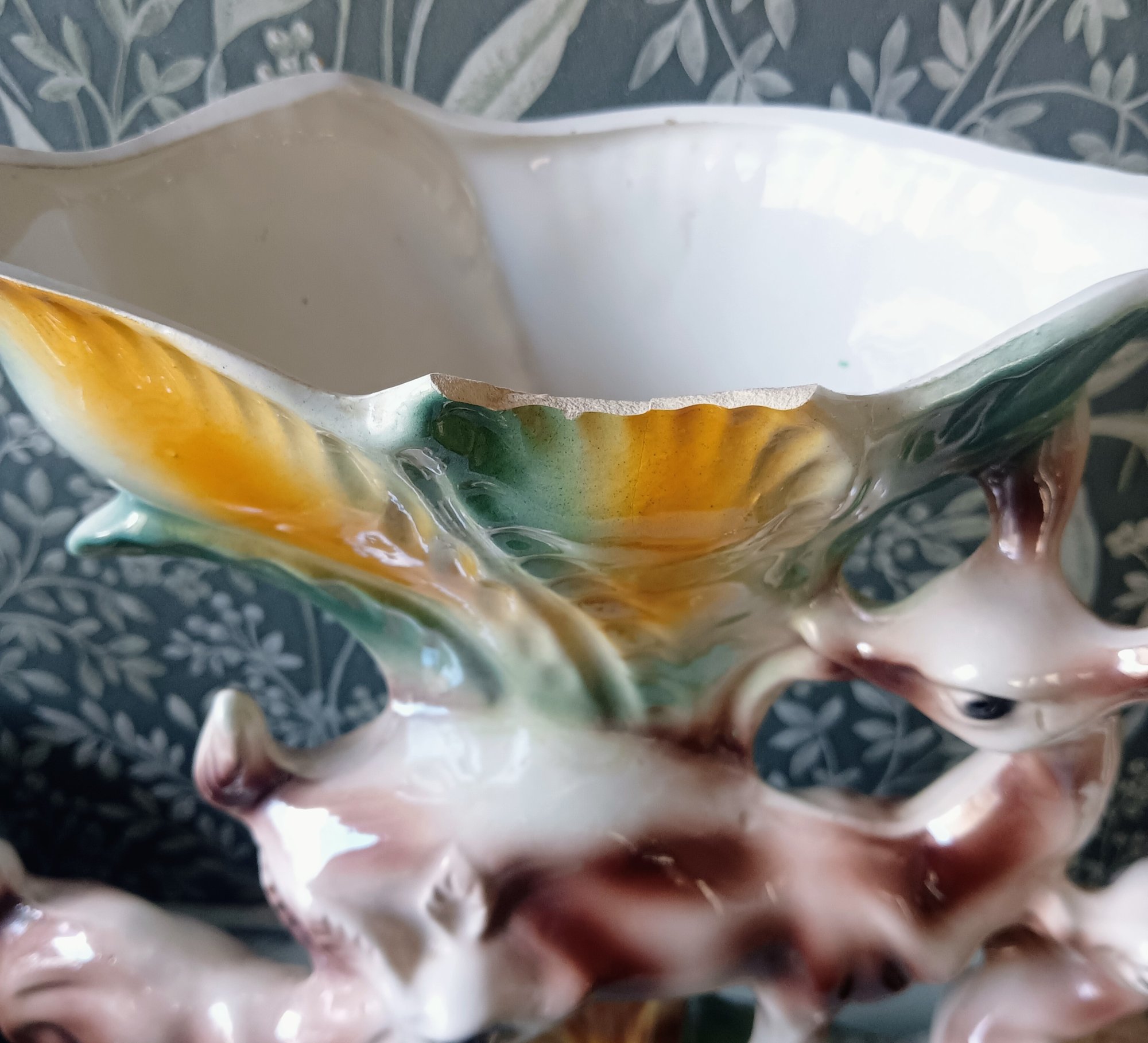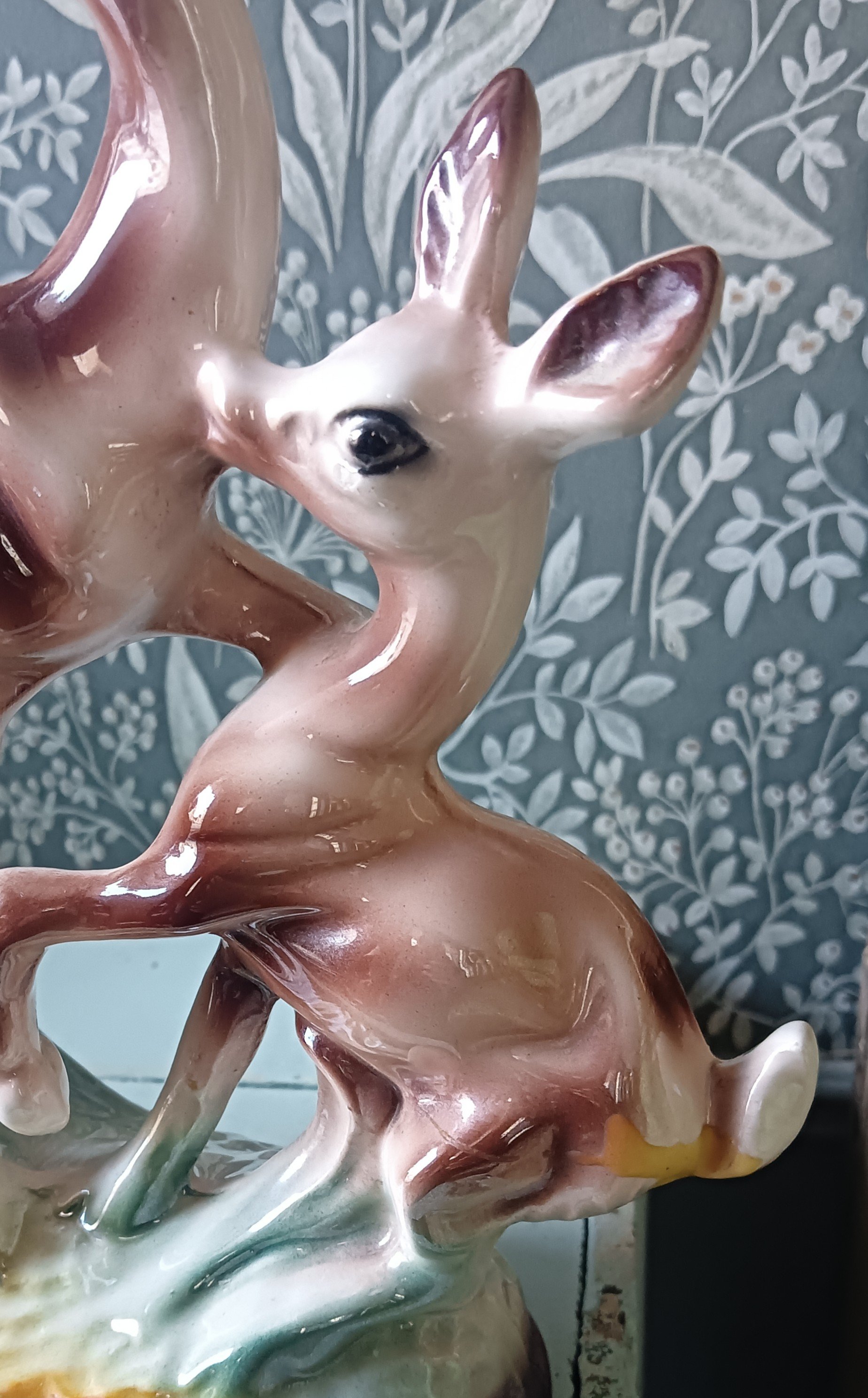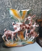Charmant vase en barbotine représentant trois petits faons façon Bambi, dans de jolies teintes dégradées de brun, vert et jaune. Un bel objet très vintage qui apportera une touche rétro et poétique à votre décoration.